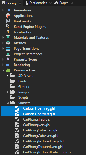 When you drop a material on the Preview or on a node in the project, Kanzi adds that material to the project resources. You can see the materials stored in the project resources in Library > Resource Files > Shaders.