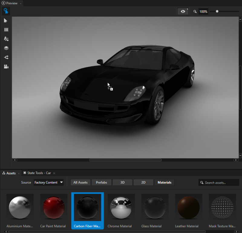 You can use a different material on different clusters of 3D objects. For example, from the Assets either drag and drop a material on the car body in the Preview, or drag and drop the material on the Car > car > RootNode > Car > CarBody node to use that material for the car body. For example, use the Carbon Fiber Material.
