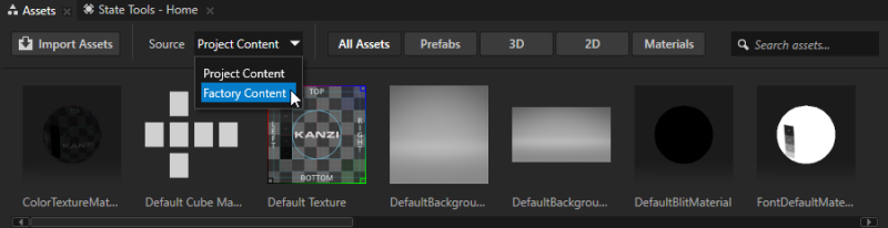 - In the Assets window set Source to Factory Content.