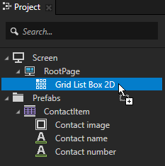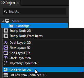 1. In the Project press Alt and right-click the node where you want to create a Grid List Box node and select either Grid List Box 3D, or Grid List Box 2D.