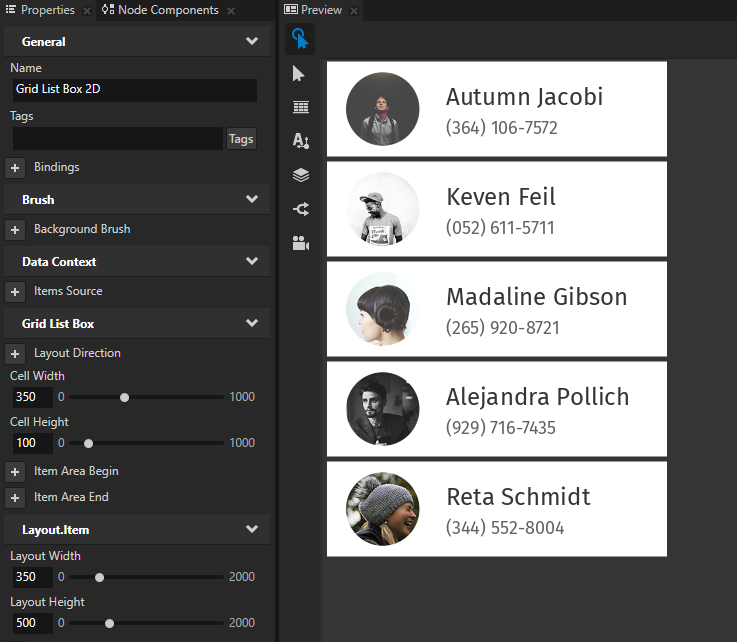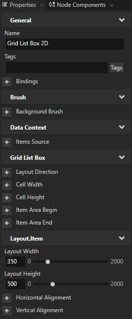 3. In the Project select the Grid List Box node and in the Properties set the Layout Height and Layout Width properties.