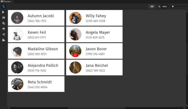 As you add items, the Grid List Box node arranges them in a grid from the top-left towards the bottom-right corner of the Grid List Box node. See Setting how a Grid List Box node arranges its items.