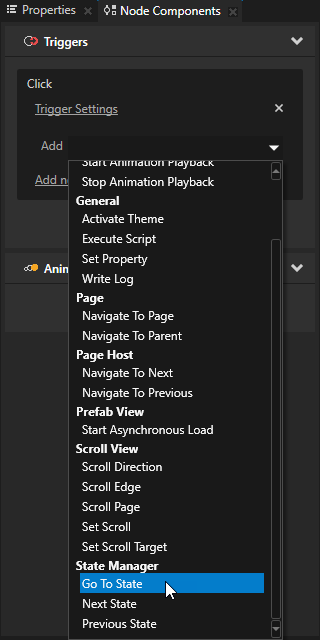 Repeat the previous step to add and configure more click triggers. For example, add the Click Cancel trigger, and in the Go to State action of the trigger set State to the state which sets the appearance of the node when that trigger is set off.