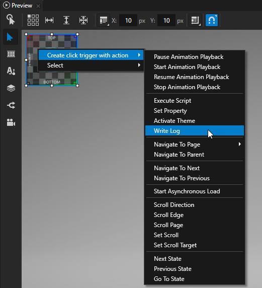 In the Preview select the Node tool, right-click the node which you want to react to clicks, and in the Create click trigger with action menu select an action. For example, select the Write Log action. When you create a click trigger with an action, Kanzi Studio adds to that node: