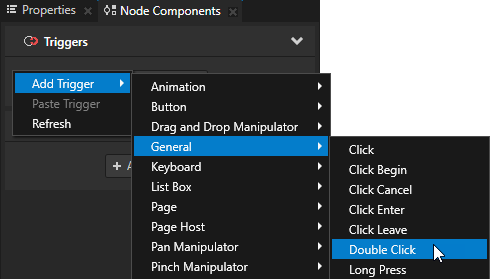 Use the Double Click trigger to react to the double-click gesture. For example, you can change the appearance of a node when the user double-clicks or double-taps that node.