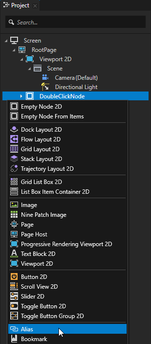In the Projectpress Alt and right-click the node you created and select Alias. Kanzi Studio creates an alias pointing to the node from which you created the alias and adds it to the resource dictionary of its nearest ancestor node that contains a resource dictionary. Access alias target nodes using the # sign followed by the name of the alias.