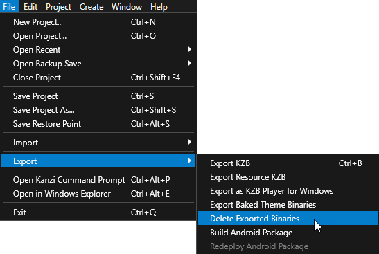 When you want to permanently remove all kzb files exported from a project select > Export > Delete Exported Binaries.
