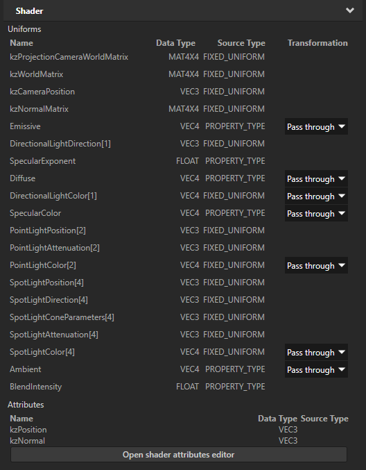 When you press the Enter key Kanzi Studio updates in the Uniforms the uniform arrays for the properties of the light types you changed.