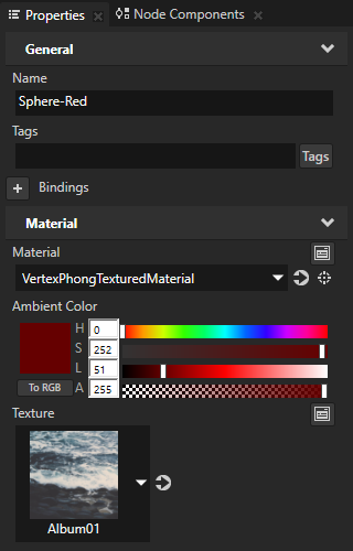 For example, to change the ambient color and texture of the material for the selected node, add and set the Ambient Color and Texture properties.