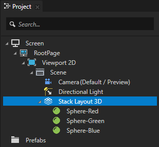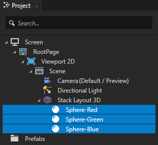 For example, press Alt and right-click the Scene node, create a Stack Layout 3D node and inside it create three Sphere nodes.