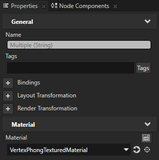2. In the Project select the 3D nodes the appearance of which you want to adjust, and in the Properties set the Material property to the VertexPhongTexturedMaterial material.