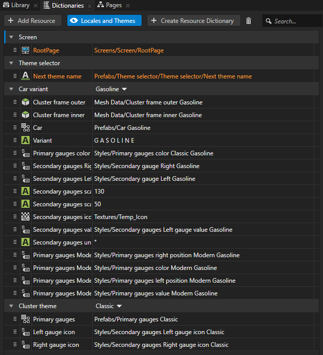 The Dictionaries window shows the resources in the resource dictionaries accessible to the node you select in the Project and the resources in the localization tables and theme groups in the project. See Localization and Theming your applications.