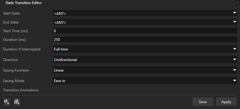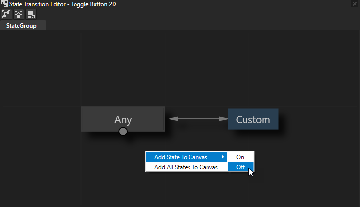 You can set custom transitions between specific states. You can add states to the State Transition Editor canvas and configure transition settings between them.