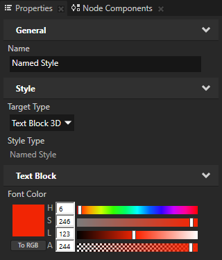 Named styles define the look and feel only for the selected instances of a node type, or override the target styles. For example, if you create a target style for the Text Block 3D, you can override that style with a named style.