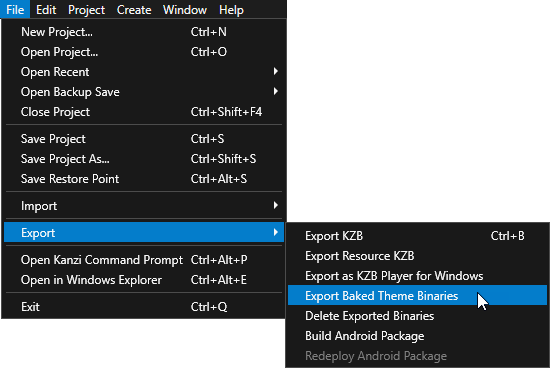 When you export Themes you can quickly end up with a large amount of files and directories. To permanently remove all kzb files exported from a project select > Export > Delete Exported Binaries.