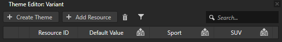 A Theme resource pack is a kzb file which contains only the resources for a selected Theme. Use this approach when the storage or memory on your target device is limited, but you want to change the application theme at runtime without having to load additional kzb files. For example, with this approach you can create from one Kanzi Studio project applications for two car variants (Sport and SUV), where each has two Themes (Blue and Red) between which you can switch without loading additional kzb files.