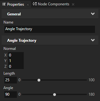 Use an Angle Trajectory to create a path where two straight lines form an angle in 3D space. Use trajectories as paths along which Trajectory Layout 3D and Trajectory Layout 2D nodes arrange their child nodes, and along which Trajectory List Box 3D nodes move their items. See Using the Trajectory Layout nodes and Using the Trajectory List Box 3D node.