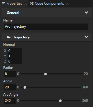 Use an Arc Trajectory to create a path in the shape of an arc in 3D space. Use trajectories as paths along which Trajectory Layout 3D and Trajectory Layout 2D nodes arrange their child nodes, and along which Trajectory List Box 3D nodes move their items. See Using the Trajectory Layout nodes and Using the Trajectory List Box 3D node.