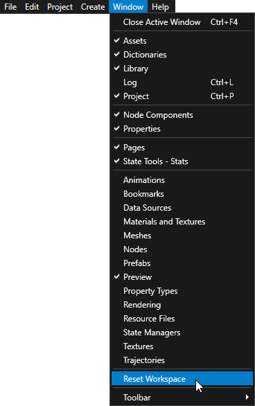 To restore the workspace to the default state, in the main menu select > Reset Workspace.