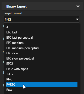 - PVRTC Encoding Quality property to either Fastest, Fast, Normal, High, or Best.