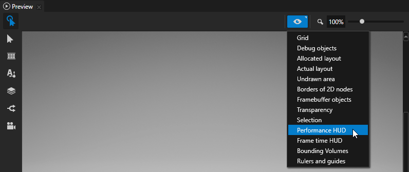 To analyze the performance and inner structure of your application in Kanzi Studio, in the Preview click