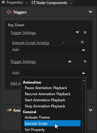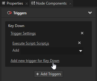 In the Node Components add to the Key Down trigger the Execute Script action.