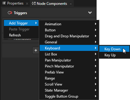 With this condition when the user presses down the → (Right Arrow) key, the Key Down trigger executes the actions you set in the trigger. For a list of the keyboard key codes used in Kanzi, see Keyboard input codes reference.