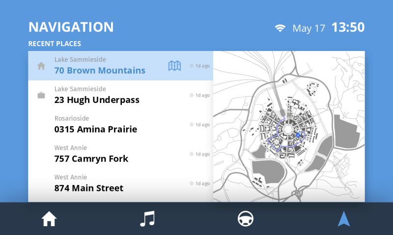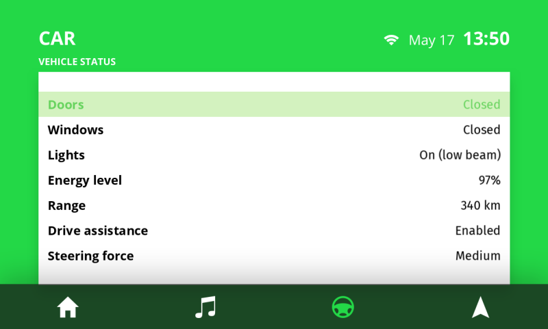 // Get the Page node Home. var homePage = node.lookupNode('#Home'); // Get the > Grid Layout 2D > HomeButton node. var homeButton = node.lookupNode('#HomeButton'); // The value of the Page.State property tells whether the Page or Page Host node is active: // - If the value is 0, the node is inactive and invisible. // - If the value is 1, the node is active and visible. var homeActive = homePage.getProperty('Page.State'); var mediaPage = node.lookupNode('#Media'); var mediaButton = node.lookupNode('#MediaButton'); var mediaActive = mediaPage.getProperty('Page.State'); var carPage = node.lookupNode('#Car'); var carButton = node.lookupNode('#CarButton'); var carActive = carPage.getProperty('Page.State'); var navigationPage = node.lookupNode('#Navigation'); var navigationActive = navigationPage.getProperty('Page.State'); var mapPage = node.lookupNode('#Map'); var mapActive = mapPage.getProperty('Page.State'); // Check which application Page node is active and navigate to the next application. if (navigationActive == 1 && mapActive != 1) { carPage.navigateToThisPage(); // Set the Toggle State for the button of the next application to 1. // Toggle State Controller Property controls the state of these toggle buttons. carButton.setProperty('ButtonConcept.ToggleState', 1); } else if (carActive == 1) { mediaPage.navigateToThisPage(); mediaButton.setProperty('ButtonConcept.ToggleState', 1); } else if (mediaActive == 1) { homePage.navigateToThisPage(); homeButton.setProperty('ButtonConcept.ToggleState', 1); }
