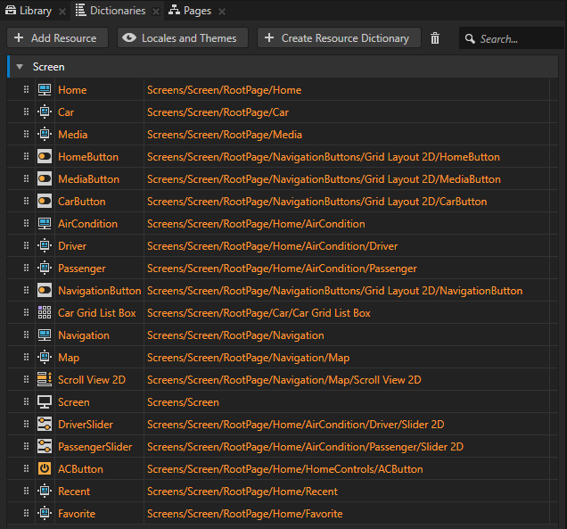 To try this out in the Kanzi Studio Preview, click the Preview window to set the focus to the Preview window and press the → (Right Arrow) key on your keyboard to navigate between the Home, Media, Car, and application screens. When Kanzi activates each of the Page nodes, it sets the value of the Toggle State property of the Toggle Button which navigates to that Page to 1.