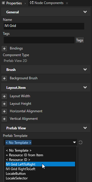 - Select the IVI Grid Prefab View 2D node, and in the Properties add and set the Prefab Template property to IVI Grid LeftToRight.
