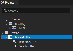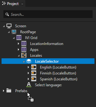 - In the Project > IVI Grid > Locales drag the LocaleSelector node from the Project to the Prefabs to create a prefab.