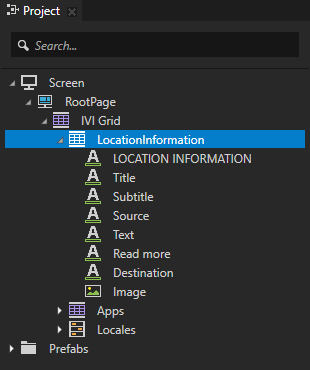 In this section you create prefabs from the LocaleSelector and IVI Grid nodes. You use the LocaleSelector prefab to position the locale buttons and the IVI Grid prefabs to set the correct layout for the selected locale. In the next step you change these prefabs so that they correctly position the application user interface elements for left-to-right or right-to-left locales.