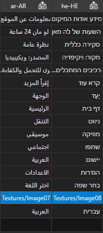 - In the Library > Localization double-click the Localization Table (Main) and in the Localization Editor set the LocaleDisplayName for Arabic to العربية and for Hebrew to עברית.