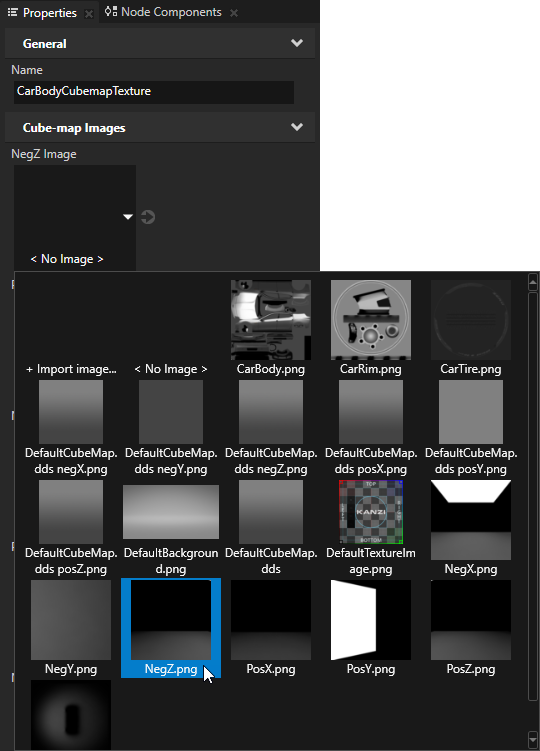 - In the Properties of the CarBodyCubemapTexture set the Cube-map Images properties to their respective images. Set the NegZ Image property to image NegZ.png, PosZ Image property to PosZ.png, and so on until you have set all the images.