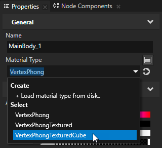 - In the Library > Materials and Textures > Materials select MainBody_1, and in the Properties set the Material Type property to VertexPhongTexturedCube.
