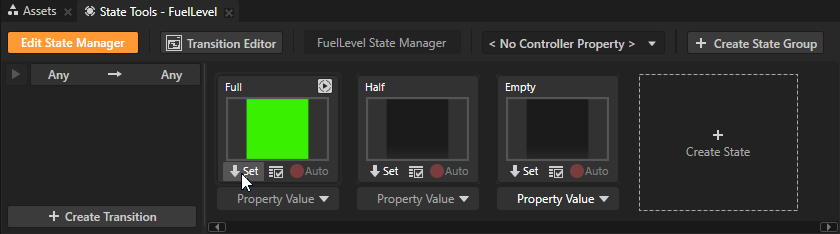 In this section you create a state manager with states that set how the fuel indicator looks when the level of fuel is full, half full, and empty. To indicate the amount of fuel, in each of the states you use one of the color brushes you created in the previous section.