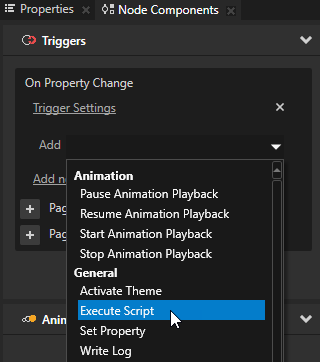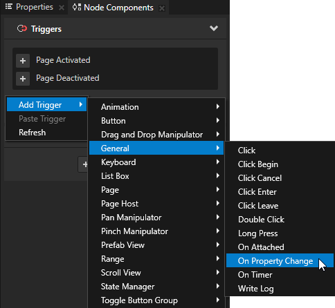 - In the Project select the RootPage node, in the Node Components right-click, and select Add Trigger > General > On Property Change.