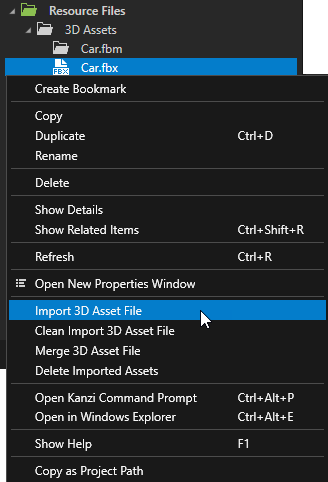 3. In the Library > Resource Files > 3D Assets right-click the fbx file that caused Kanzi Studio to terminate, and select Import 3D Asset File to import the file.