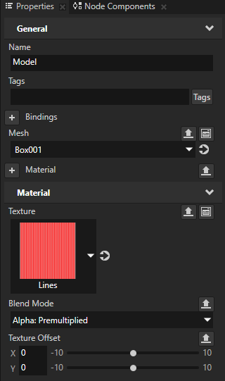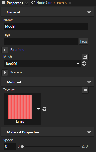 In the Project > Prefabs select the Model > RootNode > Model node and in the Properties set the material for the 3D model to the material you want to use for the UVs. Make sure you use a material which supports textures. A mesh is a collection of vertices, edges, and faces that define the shape of a solid object in 3D with flat faces and straight edges and the triangles that form the surface between the points. See Using meshes and Creating textured materials.