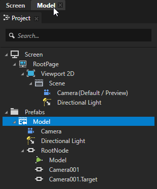 In the Project > Prefabs select the Scene named after the 3D model you imported in the previous step and double-click it to open it as a composition. To see the Scene composition rendered in the Preview, it must contain a camera and at least one light node.