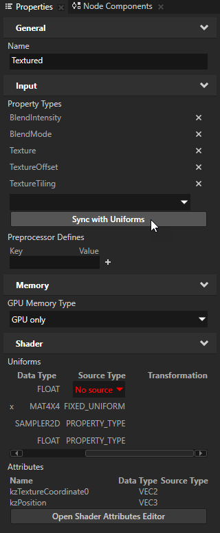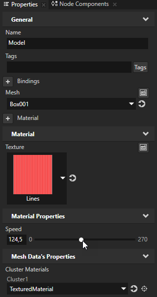 This offsets the texture on the x axis based on the value you set in the custom property. The speed is divided by 270.0 because the Upper Bound of the Speed property is set to 270 and the UV texture coordinates work in the space of 0.1. To offset the texture on the y axis, in the Shader Source Editor use kzTextureCoordinate0.y. To offset the texture on the x and y axes, use kzTextureCoordinate0.