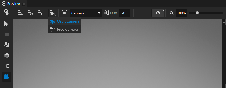 Use the Camera node to show the content of a Scene in your Kanzi Studio project and in your Kanzi application. When you create a Scene it contains only a Camera node and a Directional Light. This is the default Camera node and preview camera for that Scene. When a Camera node is a preview camera, in the Preview you see the Scene through that Camera node. In the Project the preview camera is marked with (Preview).