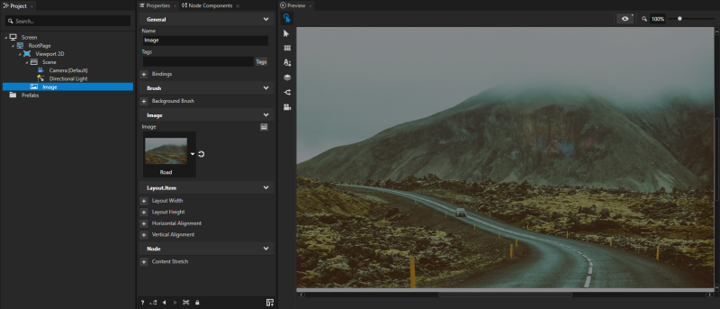 - Drag an image from the Assets and drop either in the Preview or any 2D node in the scene graph in the Project.