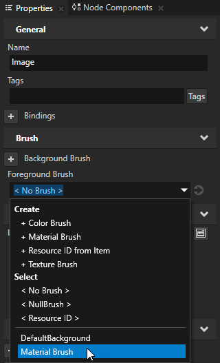 - In the Properties add and set the Foreground Brush property of the Image node to the material brush that uses the material you want to apply to that node.