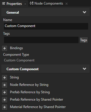 For example, to create a custom 3D node Custom Component with custom property types that provide references to nodes and resources of a specific type: