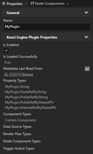 4. In Kanzi Studio in the Library > Kanzi Engine Plugins select your plugin. In the Properties you can see the custom property types.