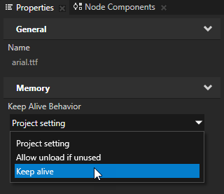 To set how Kanzi Engine handles individual unused resources when you call ResourceManager::purge, in the Library select a resource, and in the Properties add and set the Keep Alive Behavior property:
