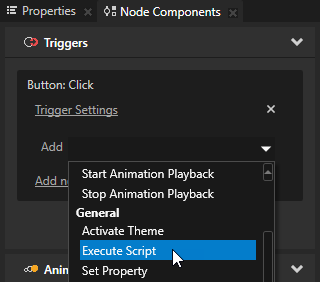 2. In the Node Components > Triggers section in the trigger you want to use to execute a script, click the Add dropdown menu, and select the Execute Script action.