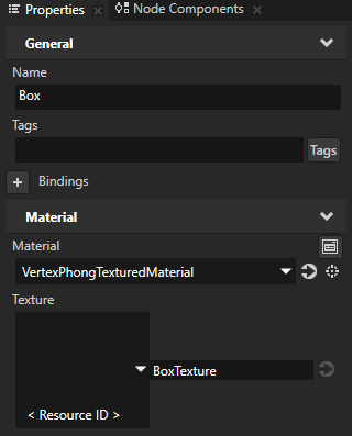- In the Project select the node you created in the previous step, in the Properties add the Texture property, and set it to a resource ID.