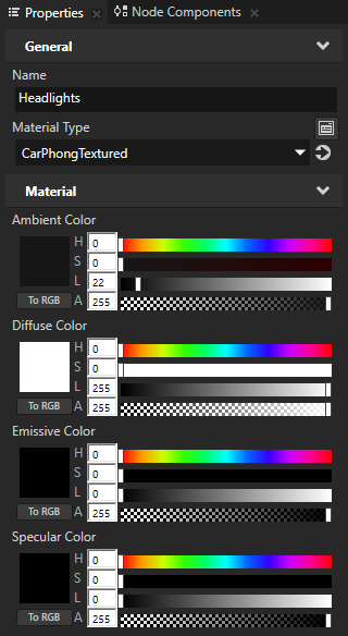 4. In the Library > Materials and Textures > Materials select the Headlights material and in the Properties set: